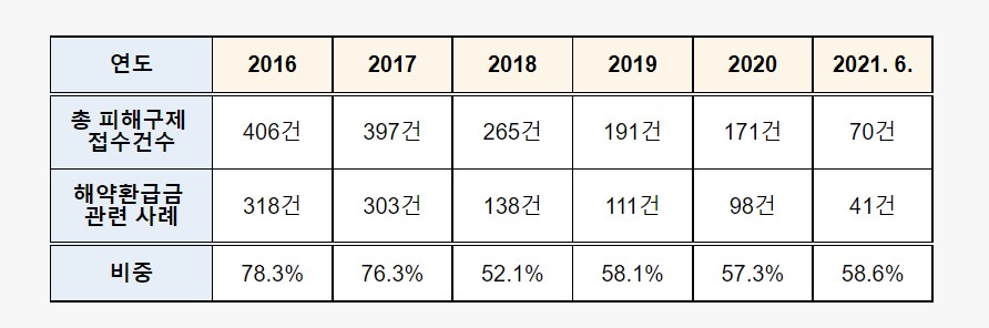 이전까지 실제로 한국소비자원의 상조서비스 관련 피해구제 접수건수 중 해약환급금 관련