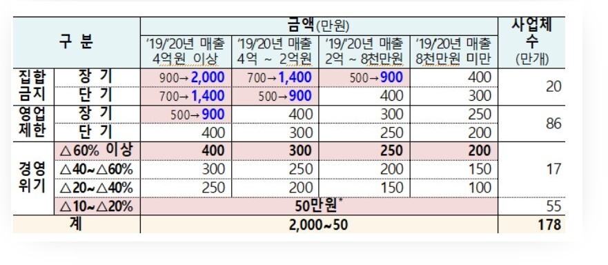매출 4억원 이상의 장기집합금지 업종에 대한 지원금이 최대 금액